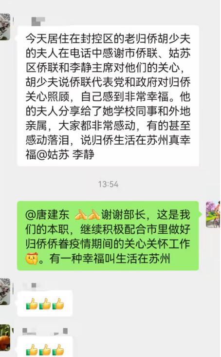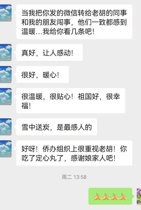 特殊时期的特别关怀,让归侨侨眷们切实感受到了党和政府的关心,为他们提供了实实在在的帮助,也使得侨联成为广大归侨侨眷心目中真正的“娘家人”。归侨胡少夫说侨联代表党和政府对归侨关心照顾,自己感到非常幸福。他的夫人也激动地将此事分享给了她的同事和外地亲属,大家纷纷表示归侨生活在苏州真幸福,“雪中送炭,是最感人的”“好呀!侨联组织上很重视老胡!你吃了定心丸了,感谢娘家人吧!”“很温暖,很贴心!祖国好,很幸福!”。