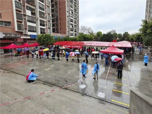 在双阳街道阳光花园城(新岭、坪山)采样点,一位头发灰白的党员志愿者在细雨中维持秩序,叮嘱群众保持一米距离,大家都亲切地叫他“老关”。
