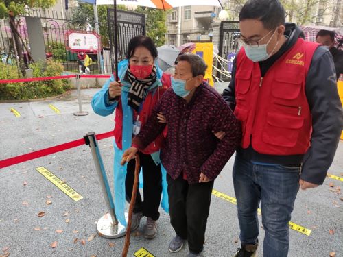 宁侨志愿者帮助行动不便的老人进行核酸检测