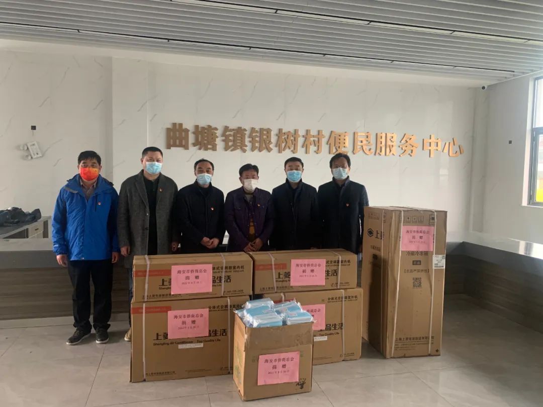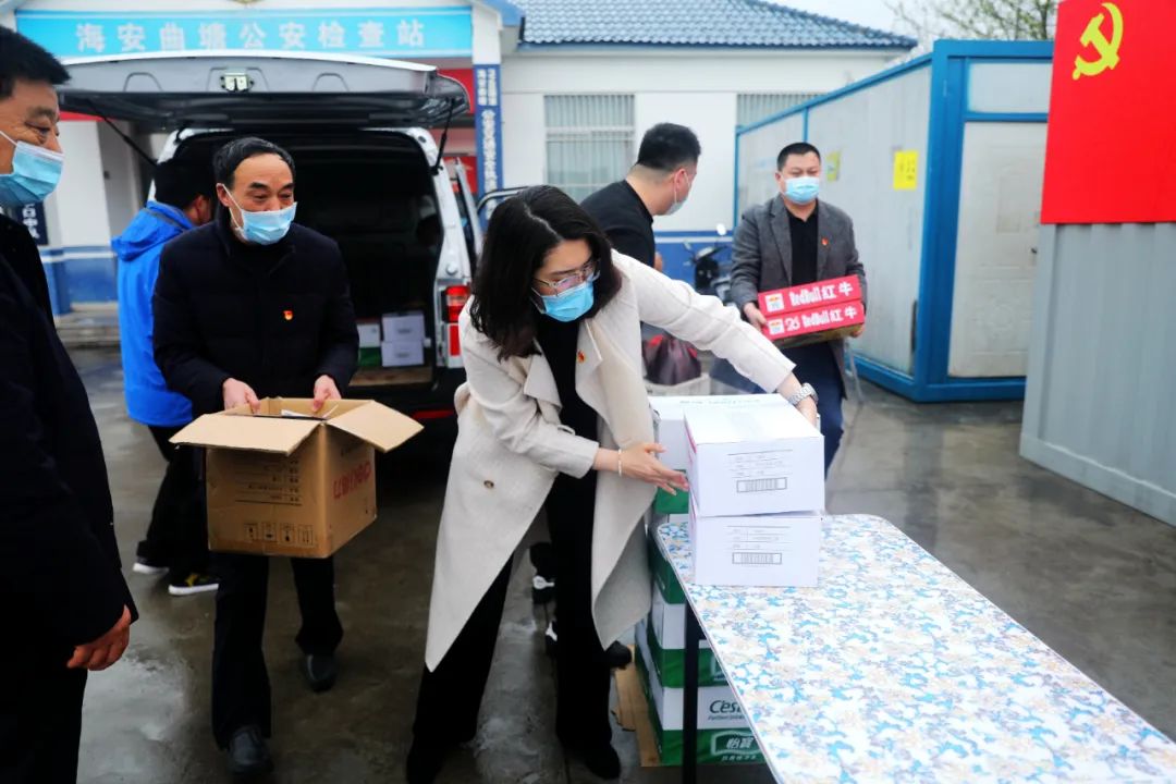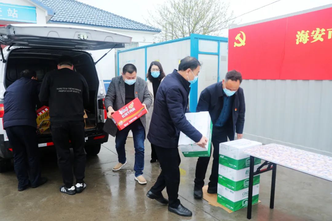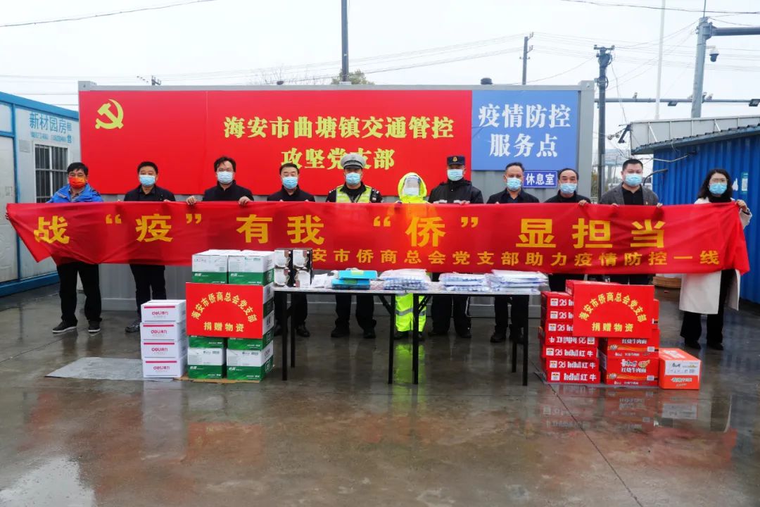 在海安西328国道曲塘镇疫情防控卡口、曲塘镇银树村,江苏瑞恩电气股份有限公司、南通远景电工器材有限公司、江苏万拓新材料有限公司、江苏四新界面剂科技有限公司、江苏美达自粘材料有限公司等爱心侨企为基层一线送上捐资物资、送上关爱保障,让“冲锋在前线”的同志们得到充足的“后方补给”。