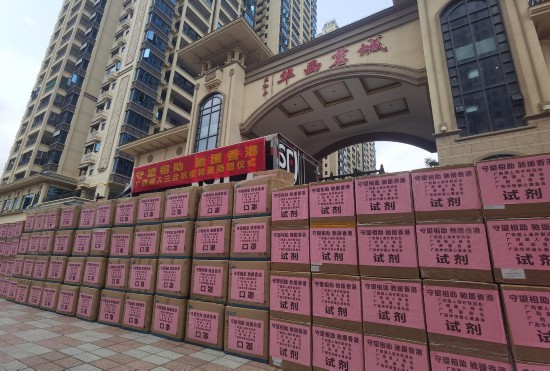 共有2万人份的新冠检测试剂、11万个KN95成人口罩、1.1万个儿童口罩等抗疫物资通过专车运往香港。