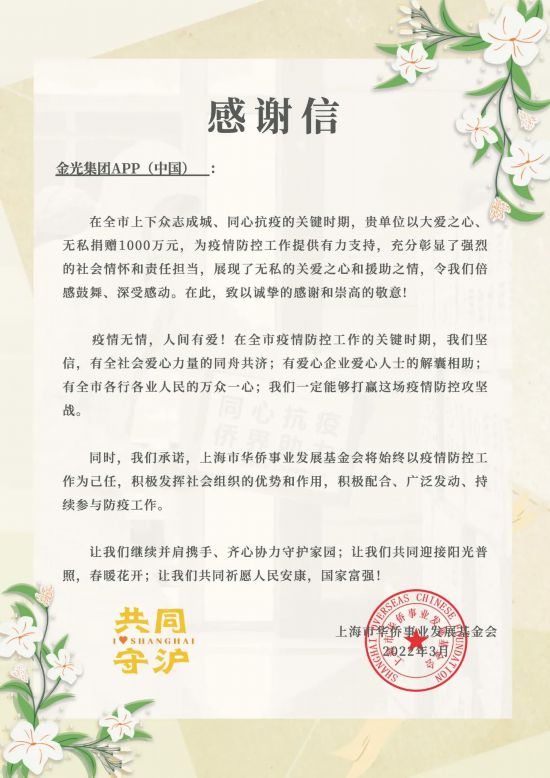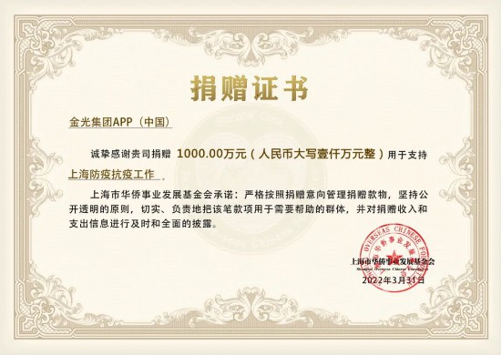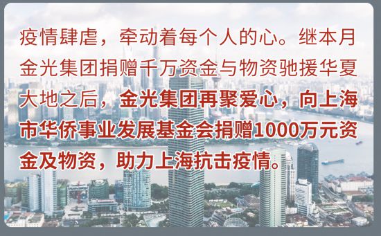 此次金光集团再次捐赠的1000万元物资及现金将拨付给上海市华侨事业发展基金会,并在第一时间紧急调拨到上海市集中隔离收治点及上海各地重点防疫的社区、高校、医院、基层单位等用于开展紧急救治、应急防控和采购生活、医疗及防护物资等。