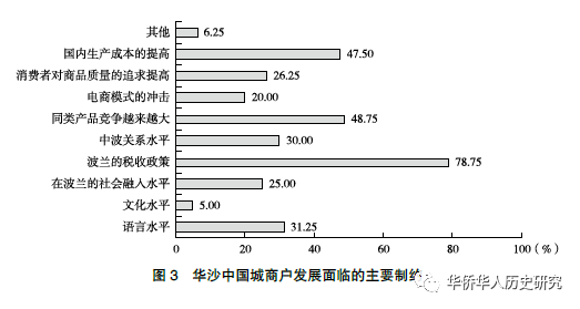 由于少数华商曾有利用法律空隙,游走在“灰色”经营边缘的行为,导致这一群体被推上了税务稽查的“风口浪尖”。事实上,这一问题在欧洲其他国家同样存在。问卷调查数据显示,约79%的受访者认为波兰税务政策是当前华商面临的主要难题(见图3)。从波兰华商的发展历程来看,在过去较长时间段里,华沙中国城存在的灰色经营模式为小微企业带来了暴利,帮助华商积累了原始资金。据受访者R12 回忆,20 世纪90 年代波兰走上经济转轨道路后,市场经历了较长的混乱无序时期,政府部门受贿现象严重,在客观上助推了这种灰色经济的发展。据中国驻波兰大使馆发布的信息,波兰税务部门对华沙中国城的突击性税务稽查从2017 年年底就已经开始了,其重点是稽查商业行为中的偷税漏税问题,对华沙中国城的营商环境造成了很大影响。