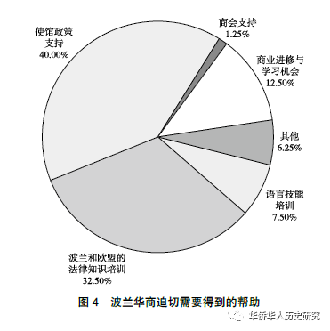 在关于具体利益诉求和迫切需要得到帮助的调查中,认为当前最需要使馆介入与支持的华商比例最高,为40.00%;其次是对于波兰和欧盟法律知识的培训,占32.50%(见图4)。