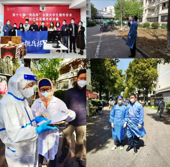左上图许斌教授(右三)指导的大学生课外学术科技作品获二等奖,右上图许斌教授在呼叫学生下楼做核酸检测,左下图沙建美医生(右)在指导学生志愿者做核酸检测,右下图一直在校园里参加抗疫工作的许斌教授与沙建美医生伉俪