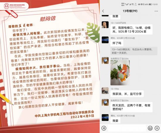 左图为蓝箭老师获得的学院党委的慰问信,右图为蓝箭居住的楼里居民互换食品的帖子