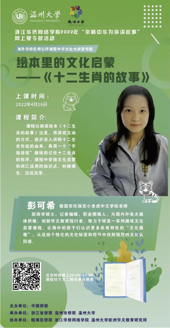 十二生肖是中华民族古老的民俗文化,是中国传统文化重要的组成部分,也是最具特色的民族文化之一,是普及率最高的中华传统文化符号。为了让海外华裔青少年更加直观地认识并了解十二生肖背后所蕴含的中华文化内涵,本期夏令营活动特别邀请德国布伦瑞克小老虎中文学校教师彭可希为学员们带来“绘本里的文化启蒙-《十二生肖的故事》”。