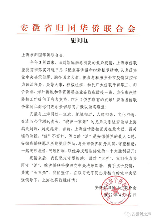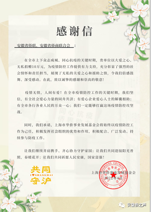 日前,安徽省侨联积极对接上海市侨联,第一时间发出慰问电,转达安徽侨界对上海疫情防控工作的关切。同时,将省侨联、省侨商联合会捐赠的10万元通过上海市华侨事业发展基金会转赠给疫情防控一线。上海市华侨事业发展基金会于4月15日发来《捐赠证书》和《感谢信》,表达对安徽省侨联和省侨商联合会的谢意。