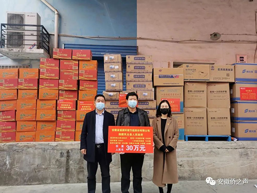 4月2日,省侨商联合会常务副会长单位安徽省通源环境节能股份有限公司党总支书记张娜、公司副总经理兼水务事业部总经理王立余一行从合肥出发,一路逆行前往淮南市凤台县,将医用外科口罩、一次性防护服、防护面罩等一批价值30万元的当地紧缺防疫物资交付至凤台县城关镇政府。