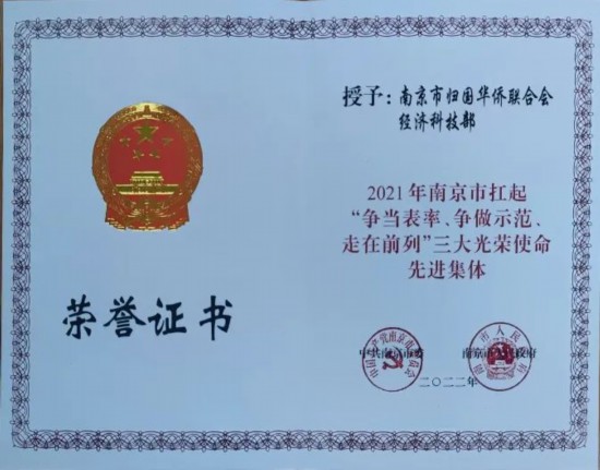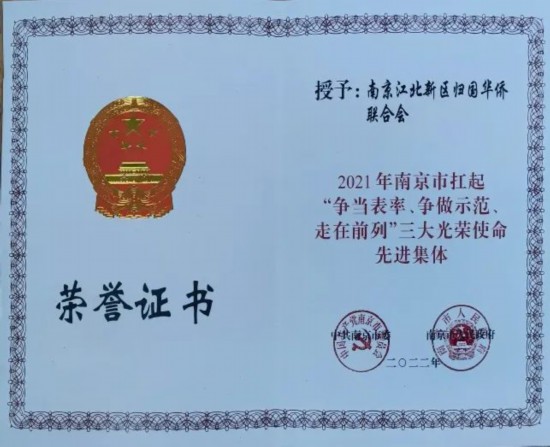 南京市侨联经济科技部、江北新区侨联被授予“2021年南京市扛起‘争当表率、争做示范、走在前列’三大光荣使命先进集体”称号。