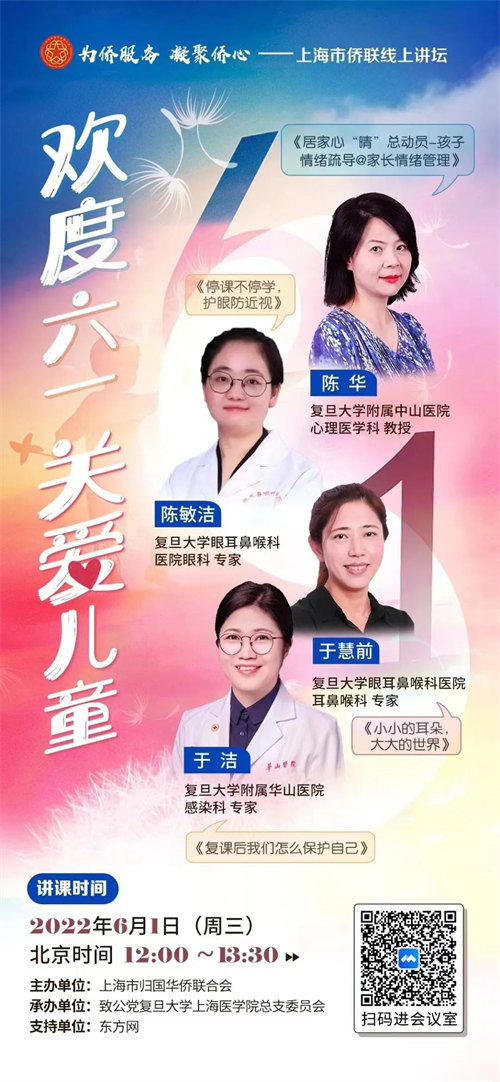 以“欢度六一·关爱儿童”为主题的线上讲坛活动由上海市侨联主办、致公党复旦大学上海医学院总支委员会承办,将于6月1日(周三)中午11:30-13:45以腾讯视频会议方式举行。现在,您就可用手机扫描海报中的二维码,提前预订会议了哦。