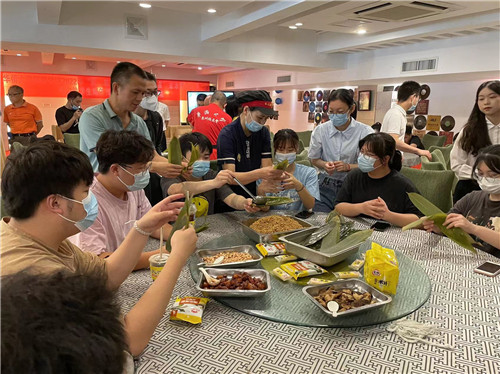 一大早,华侨大学第一餐厅提前备好丰富且多样的食材,有粽叶、鹌鹑蛋、香菇、虾米、三层卤肉、香菇、干贝、糯米等,境外侨生纷纷报名参加,一场别开生面的包粽子活动开始了。一折叶,二盛料,三压实,四包折,五扎绳……,看似简单的几个步骤,可真是难为我们一些海外侨生们,但是通过餐厅师傅手把手的指导和大家的通力配合互助下,一张张绿色的粽叶在他们的手里变成了一个个饱满的粽子,经过一上午的努力,大家包了1000多个粽子。
