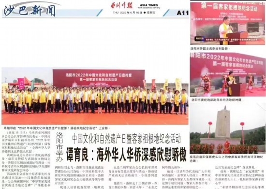 马来西亚沙巴《亚洲时报》2022年6月16日刊发洛阳2022年文化与自然遗产日宣传暨第一届客家祖根地纪念活动的消息。《亚洲时报》对此次活动进行通篇报道。马来西亚《诗华日报》《华侨日报》也同期进行刊发或转发此次纪念活动。