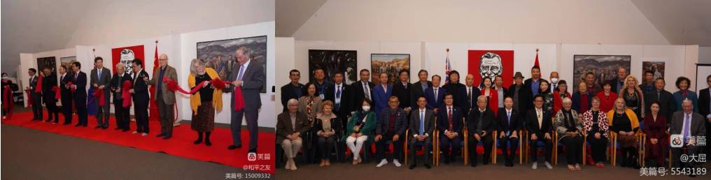 新西兰和平之友联谊会会长乔治兵,中国驻奥克兰总领事馆总领事阮平,中国驻新西兰大使馆教育参赞董志学,国会议员陈耐思, 国会议员Shanan Halbert. 奥克兰市议员杨宗泽, 市议员Chris Darby, 毛利酋长Anthony, 新中友协奥克兰分会主席Michael Hart, 策展人邓邦镇教授和卢波教授,新西兰文化艺术基金会主席饶金生到会祝贺并剪彩。