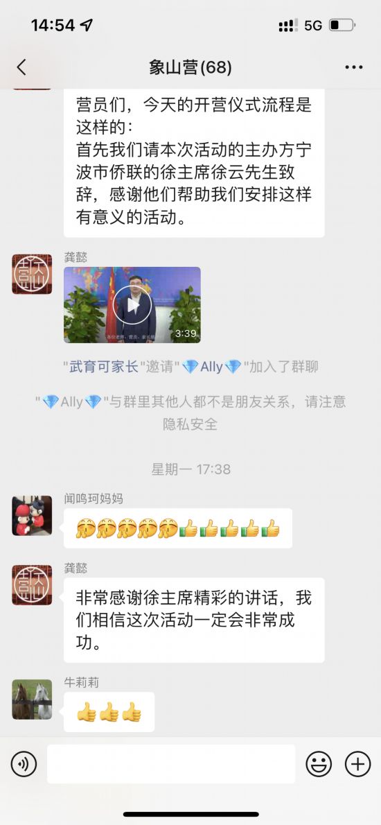 宁波市侨联党组书记徐云在致辞中表示,团结统一的中华民族是海内外中华儿女共同的根,博大精深的中华文化是海内外中华儿女共同的魂,实现中华民族伟大复兴是海内外中华儿女共同的梦。希望华裔青少年朋友们以这次网上营为契机,进一步体验中华传统文化魅力,加深对祖(籍)国的了解和对宁波的热爱,精心浇灌在心里种下的中华文化种子,从中华民族的历史和文化宝库中汲取精神营养,积极争做中华优秀传统文化的传承者、中外文明交流互鉴的促进者和中华民族伟大复兴的参与