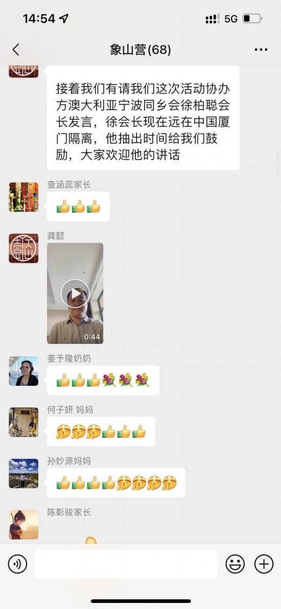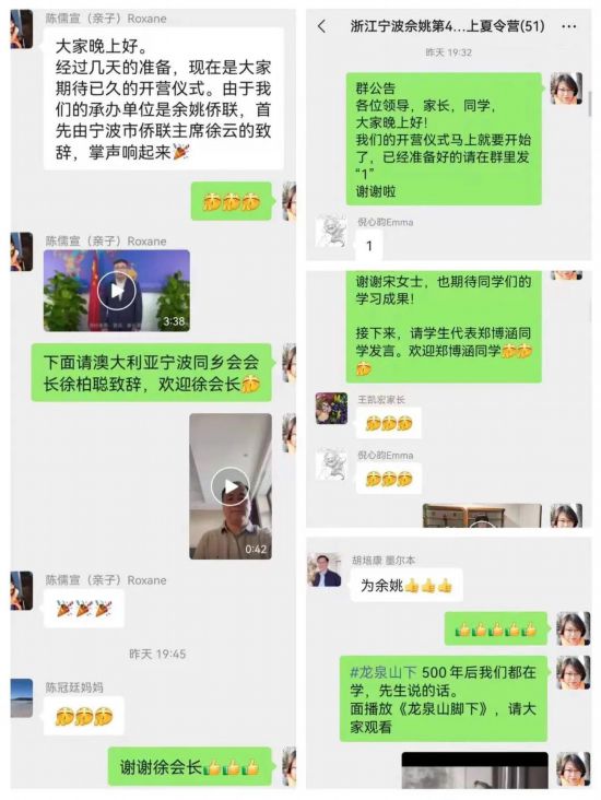 澳大利亚宁波同乡会会长徐柏聪和澳大利亚新金山中文学校校长胡培康也分别寄语参营学员,鼓励学员们通过网上夏令营的学习了解中国国情,感知中华文化,希望各位华裔青少年在活动中学有所思、学有所获、学有所成、学有所用,在领略中华文化、浙江文化、宁波文化中,做中澳文化交流的友好使者。