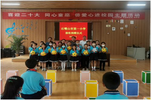 7月1日上午,宁夏侨联、石嘴山市委统战部、市侨联在石嘴山市第一小学共同开展“喜迎二十大 同心童愿 侨爱心进校园”主题活动。活动现场为小学生发放了《中小学暑期安全手册》,捐赠了足球等体育用品。此次“侨爱心进校园”主题活动是全区侨联系统深入学习宣传贯彻自治区第十三次党代会精神,充分发挥组织优势,广泛凝聚侨界力量,助力社会主义现代化美丽新宁夏建设的具体行动,也是深入开展“大学习、大讨论、大宣传、大实践”活动的生动实践。