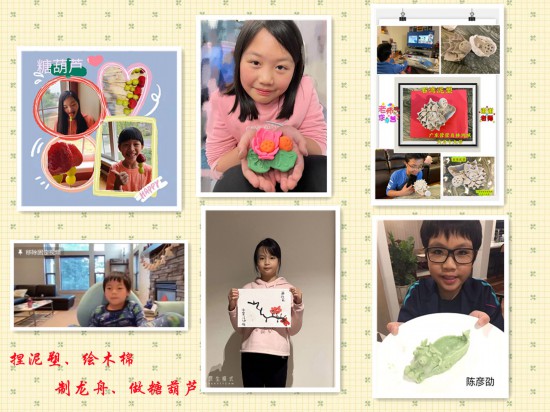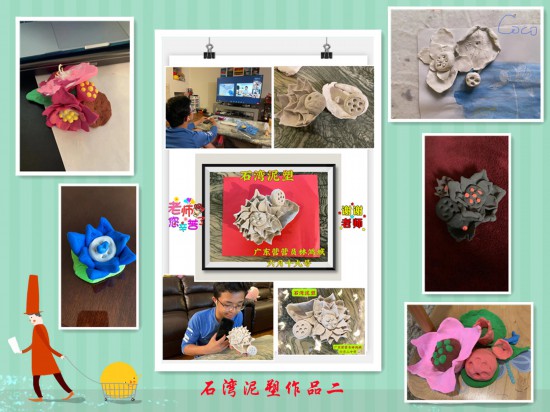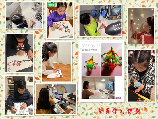 随着营期的推进,石湾泥塑、顺德龙舟、中华咏春拳、国画木棉花等极具岭南特色的直播课程尽数展现在营员面前,引起了营员们的极大兴趣,大家仿佛置身于岭南文化殿堂,流连忘返。有趣的活动不仅帮助营员们了解到岭南民俗文化、历史渊源,更激发了营员们的奇思妙想,调动了打卡积极性,提高了动手能力、锤炼了不怕困难、勇往直前的意志品质。营员林鸿城因故错过了泥塑首场直播课,为了抓住学习机会,他克服时差,一直守在电脑前直到上完第二场直播课提交了打卡作业才肯关掉电源去休息。袁小帅同学制作的荷花泥塑盆景别具一格,展现了荷花清新、雅致的独特韵味,让人印象深刻。在龙舟课上,营员们不仅了解到赛龙舟的起源,还掌握了龙舟如何划得快的科学知识,制作出栩栩如生的龙舟模型。营员陈心怡说很喜欢绘制木棉花,因为它不仅美丽还是广州的“英雄花”。张钰晓、林鸿城、陈雨泽、冯诗雅同学坚持打卡,咏春拳打得有模有样。还有的营员表示通过参加广东营自己了解到了广东是岭南文化发源地,也是中国最早开展对外贸易的省份,希望疫情结束后能来广东赏木棉,尝美食。
