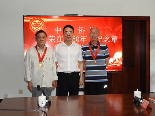 连小敏为李坤育、陈其松颁发“光荣在党50年”纪念章,并代表万立骏主席和会党组向他们表示热烈的祝贺,向中国侨联139名离退休老党员老干部致以崇高的敬意!