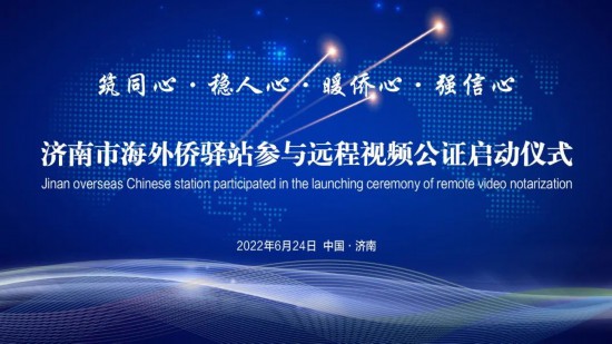 为认真学习贯彻习近平法治思想,根据司法部《关于推进海外远程视频公证试点工作的通知》要求,安照中国侨联、省侨联关于深化为侨服务,扎实推进“我为群众办实事”实践活动有关要求,6月24日,由济南市侨联与济南市司法局联合举办的“济南市海外侨驿站参与远程视频公证启动仪式”在龙奥大厦举行。中国侨联兼职副主席,山东省侨联党组书记、主席李兴钰出席仪式并讲话。济南市副市长、市政府党组成员,市公安局党委书记、局长王茂祯出席仪式并致辞。