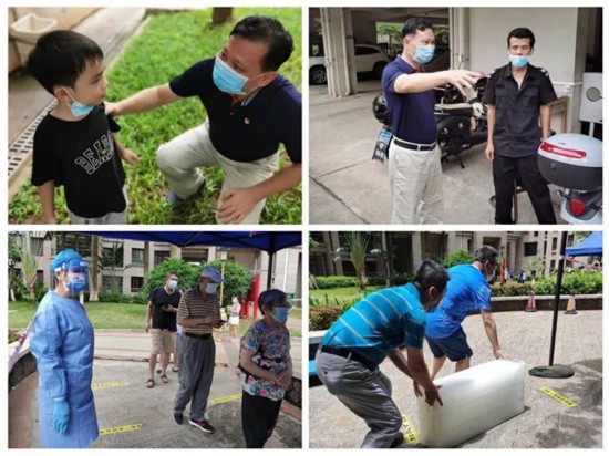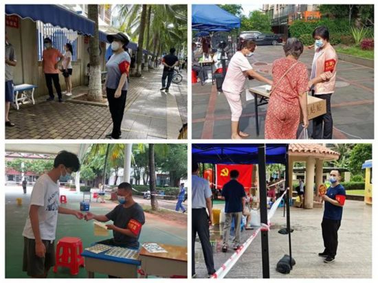 省侨联党组书记、主席黎才旺(左上、右上),党组成员、副主席苏燕(左下),党组成员、秘书长李诚(右下)带头参加所在社区、小区抗疫志愿服务