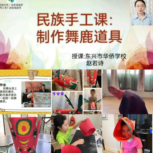 直播课上,营员们通过老师的讲解,了解到“舞鹿”文化是上思壮族儿童每年农历“三月三”进行的一种民俗传统活动,寓意祈祷家人健康长寿、福禄绵延。“舞鹿”表演时,鼓、镲和锣等乐器敲打出的音乐节奏明快强烈,营员们纷纷用手跟着打起了节拍,还有营员大胆发挥想象,巧用生活用品表演了“舞鹿”的节奏。在老师的指导下,营员们亲自动手制作了“舞鹿”的道具——鹿头,还用自己制作的道具进行了“舞鹿”表演,全身心沉浸在欢乐的节奏中。