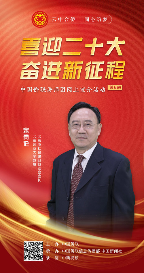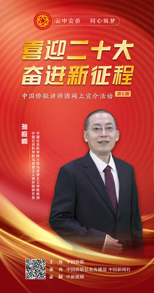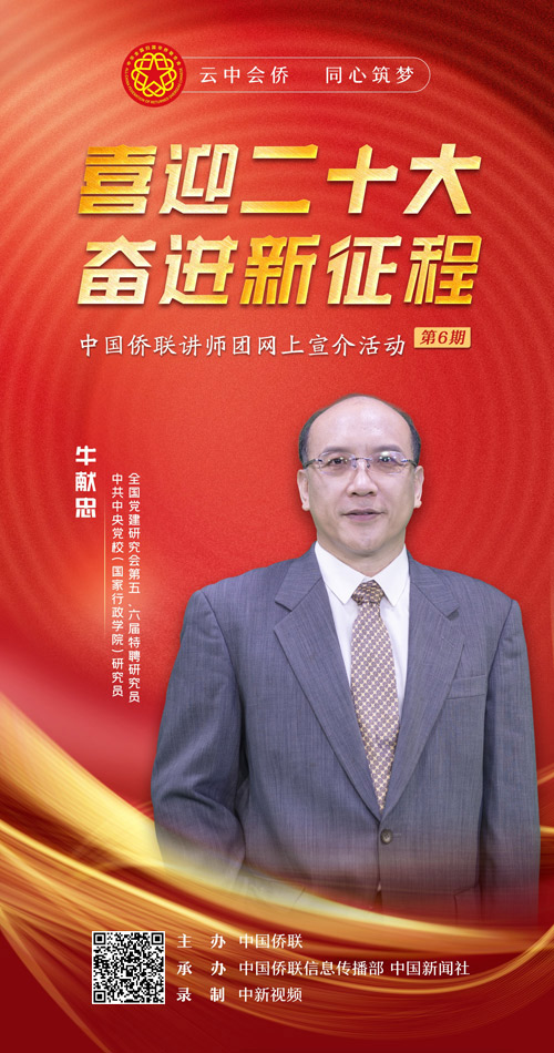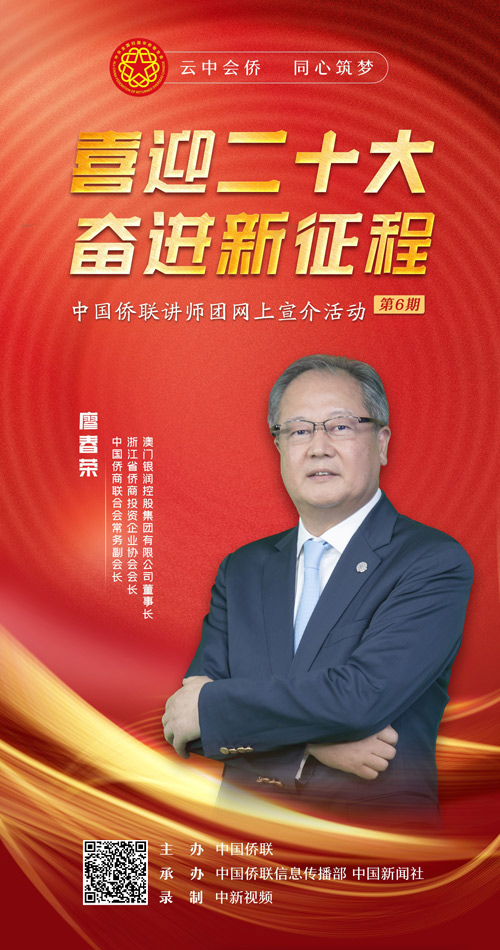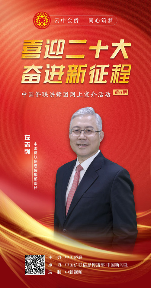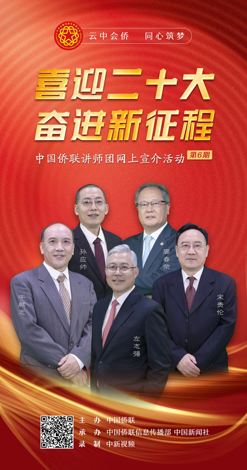 8月26日,以“喜迎二十大 奋进新征程”为主题的中国侨联讲师团(第六期)网上宣介视频正式上线。视频旨在深入学习贯彻习近平新时代中国特色社会主义思想,深刻领会“两个确立”的决定性意义,增强“四个意识”、坚定“四个自信”、做到“两个维护”,进一步发扬历史主动精神、弘扬优良传统,进一步凝聚侨心侨力侨智,踔厉奋发、笃行不怠,以更加优异的成绩迎接党的二十大胜利召开。