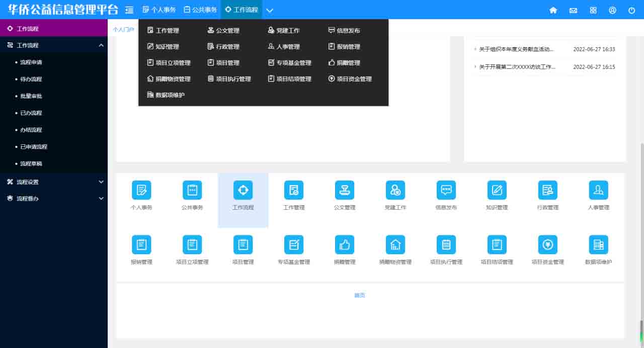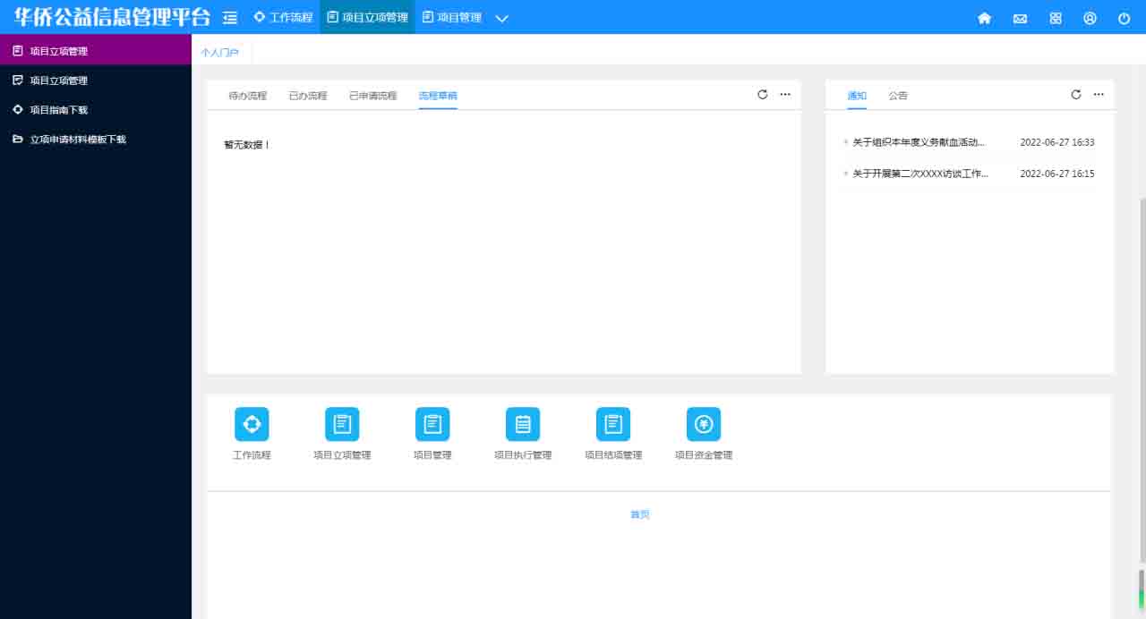 华侨公益信息管理平台分为办公管理平台和项目管理平台两部分,办公管理平台目前主要满足公益中心和中国华侨公益基金会(以下简称侨基会)内部日常管理需要;项目管理平台是面向全国侨联系统以及公益合作伙伴来使用的信息化系统,主要包括项目立项管理、项目申报、专项基金管理、捐赠管理、项目资料上报、项目执行过程管理、项目结项管理、项目资金拨付管理等。