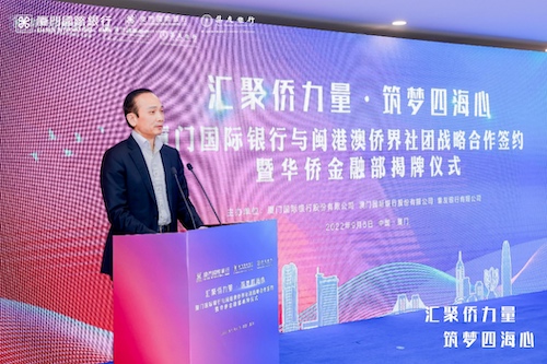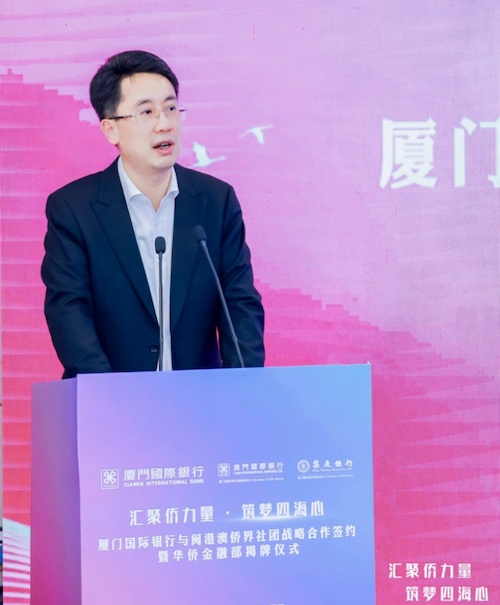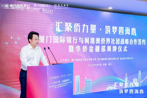 9月6日,厦门国际银行与闽港澳侨界社团战略合作签约暨华侨金融部揭牌仪式在厦门举行。福建省委统战部常务副部长、福建省侨办主任黄进发,全国政协委员、中国侨联兼职副主席、福建省侨联主席陈式海,全国政协委员、中国侨联常委、澳门归侨总会会长刘雅煌,厦门市委统战部副部长陈宏,福州市侨联主席林高星,厦门市侨联主席陈俊泳,厦门市金融局局长朱庆华,人行厦门中心支行副行长赖永文等出席签约揭牌仪式。全国政协常委、中国侨联兼职副主席余国春,中国侨联兼职副主席、中国和平统一促进会香港总会理事长卢文端,中国侨联兼职副主席、澳门特区全国人大代表、澳门归侨总会永远会长刘艺良,陈嘉庚先生长孙陈立人发来祝贺视频。中央政府驻港联络办经济部、中央政府驻澳联络办经济部以及多地侨务部门、海外商会、华侨院校共73家侨界单位发来贺信。