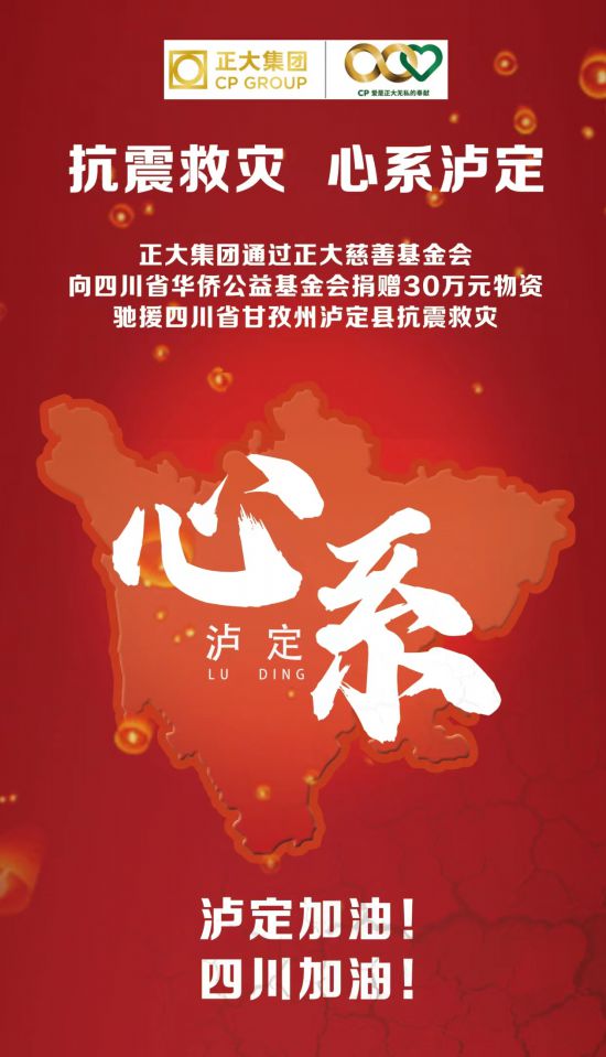 地震发生后,正大集团高度关注震区灾情,关心和惦念着受灾群众的安危,迅速开展援助行动。响应四川省侨联号召,9月7日,正大集团通过正大慈善基金会向四川省华侨公益基金会捐赠价值30万元的正大食品,驰援泸定县灾区一线。
