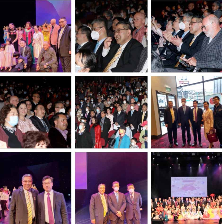 演出开始前,全体起立,奏新西兰和中华人民共和国国歌声并为刚刚去世的英女王伊丽莎白二世默哀1分钟。演出开始前,在陈水珍会长,和志耘副会长等组委会成员陪同下,参观了由中国驻奥克兰总领事馆/湖南省侨联/新西兰旅游发展部分别提供的中国56个民族服装图片/湖南张家界旅游风光图片/新西兰旅游风光图片展,以及由新西兰中华文化艺术学院承办的包括中国画,书法,剪纸,风筝,京剧脸谱等在内的中国非遗文化路演。观看了现场的书法表演,与艺术人士亲切交谈。区本老师将创的三幅国画分别赠送给了中国驻新西兰大使馆,驻奥克兰总领事馆, Hon. Michael