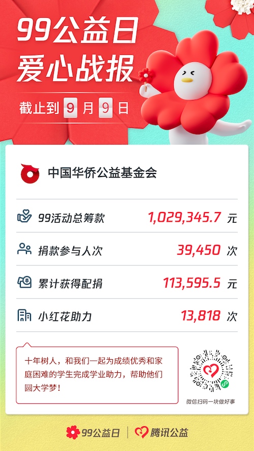 2022年,第八个“99公益日”,中国华侨公益基金会共发起7个项目。公益日三天以来(自9月7日10时-9日17时),在各界社会力量的共同努力下,本次活动取得了可喜成绩,上线项目共获39450人通过捐赠现金、捐花助力、一块做好事答题互动等方式在线支持,共获捐赠款1029345.71元,共获配捐113593.52元。