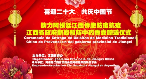 阿根廷当地时间9月11日,在阿根廷首届中华美食节暨中国城中秋庙会上,阿根廷江西总商会暨阿根廷赣商联合会举办了“喜迎二十大、共庆中国节”江西省政府防疫香囊及中秋月饼发放活动。