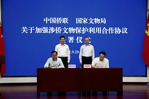 9月20日,中国侨联与国家文物局在京签署《关于加强涉侨文物保护利用合作协议》。中国侨联党组书记、主席万立骏,文化和旅游部副部长、国家文物局局长李群出席签署仪式并讲话。中国侨联党组成员、副主席候选人连小敏,国家文物局副局长顾玉才分别代表双方签署协议。