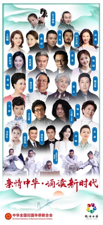 本场朗诵音乐会邀请到杨洪基、虹云、郑咏、张秋歌、魏金栋、齐克健、佟凡、杨青、张宏、王向群、王静、淮梓伦、伊泓远、阿木古郎、张倩、王晨曦、金响、张原铭、岳璐、韩晴、李欣忆、刘倩等老中青三代艺术家。他们精神饱满、激情迸发,用生动的语言和优美的旋律,深情地表达了广大侨胞对祖(籍)国的热爱和对新时代的赞美。