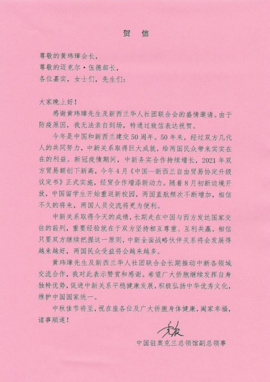 由于防疫原因,中国驻新西兰总领馆副总领事雷震通过致信向大会表达了祝贺。