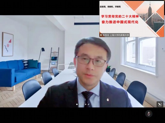 报告会特邀上海大学经济学院教授,博士生导师,经济学博士,中国社会科学院—上海市人民政府上海研究院规划与合作处处长张恒龙作题为《应变局、育新机、开新局:奋力推进中国式现代化》的报告。报告通过“百年变局与中国崛起”、“党领导现代化建设的探索”和“中国式现代化的内涵与要求”等三个方面的讲授,引导大家要全面把握中国式现代化的中国特色、本质要求和必须牢牢把握的重大原则,深刻理解全面建设社会主义现代化国家战略布局的科学性和必然性。