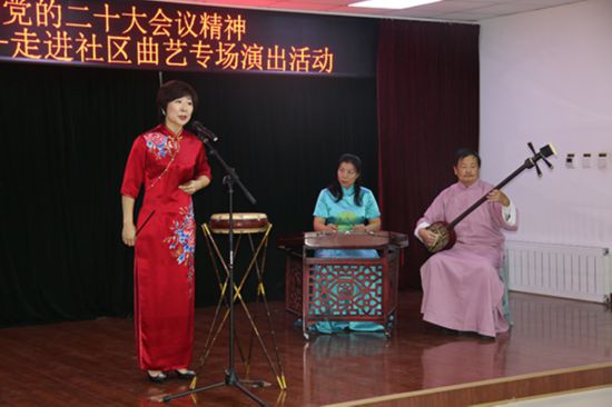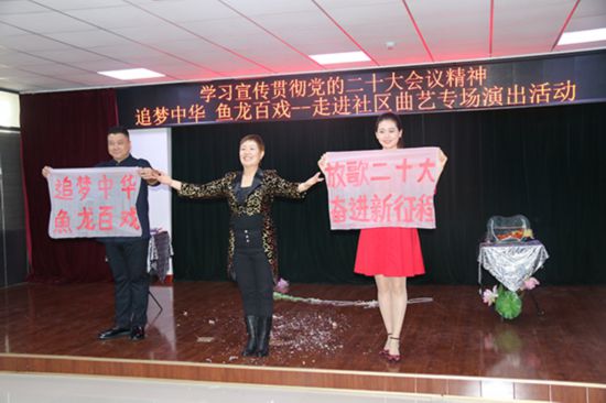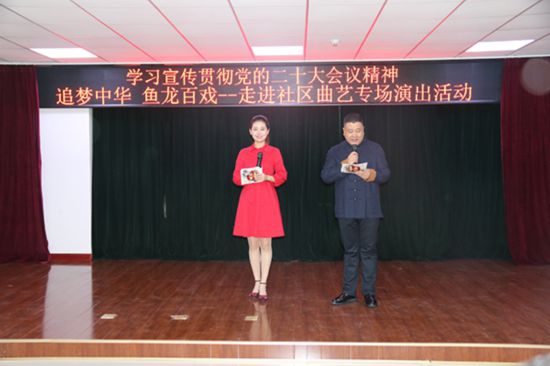 11月22日,由天津市侨联、市台联、市黄埔军校同学会、天津海河传媒中心主办,北辰区委统战部协办,北辰区侨联、北辰区青(广)源街“侨胞之家”、海河传媒中心文艺频道承办的“学习宣传贯彻党的二十大精神,追梦中华·鱼龙百戏——走进社区曲艺专场演出活动”在北辰区青(广)源街荣翠园党群服务中心举行,活动以北方曲艺创编的快板、大鼓、相声等节目生动形象地为基层群众宣传宣讲了党的二十大精神。