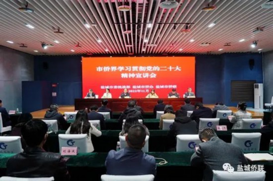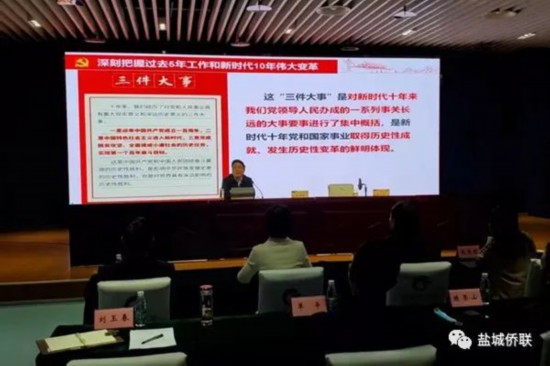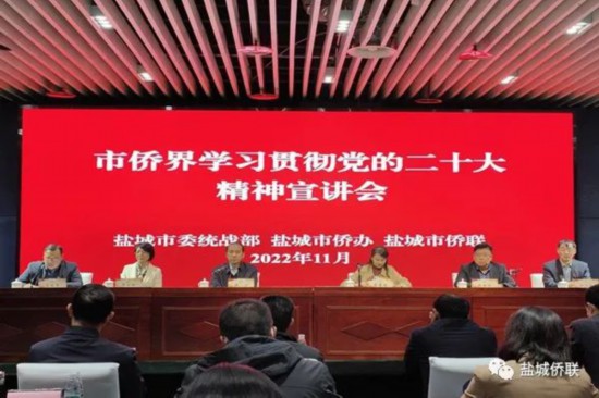 11月18日,江苏盐城市委统战部、市侨办、市侨联联合举办侨界学习贯彻党的二十大精神宣讲会,深入学习贯彻党的二十大精神,进一步加强侨界代表人士思想政治引领。盐城市委统战部副部长、市侨办主任张慧娟,市侨联党组书记、主席周卫,盐城市委统战部三级调研员、市侨办副主任陈新锋,市侨联党组成员、副主席李永红等出席会议。