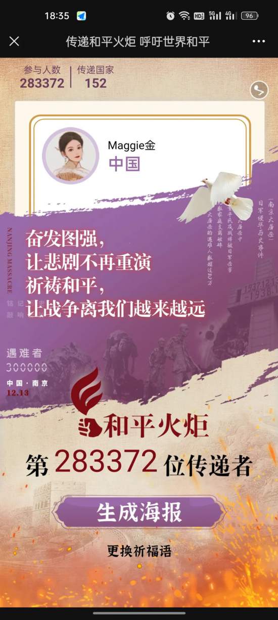 据了解,70多个国家和地区的166个侨团共同发起世界和平火炬接力,现已有150多个国家和地区约30万侨胞开展了接力传播。