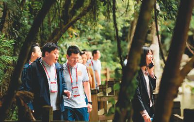 逐梦自贸港考察团成员在海南热带雨林国家公园中交谈。