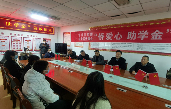 在村党群活动室,甘肃省侨联、甘肃省侨商会“侨爱心·助学金”发放仪式的横副格外醒目。“你们的学习情况怎么样?”“毕业了想干什么?学习和生活上有什么困难?”……闫鹏勋与近年来受省侨联资助的杨家庄村大学生代表亲切交谈,对他们取得的学习成绩表示祝贺。闫鹏勋鼓励受资助学生要自强自励,阳光向上,要学习知识更要学习做人,用知识改变命运,用行动回报社会。希望村里走出去的每一位大学生都能为家乡带来一片希望,为社会做出一份贡献。