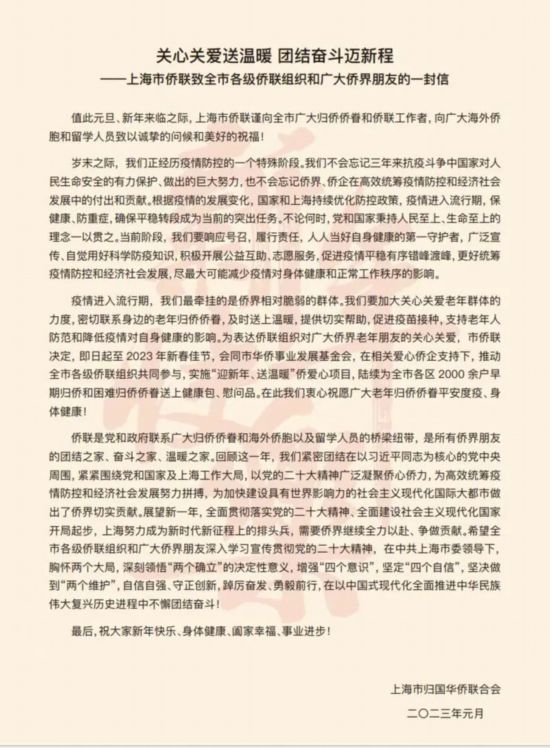 侨联是党和政府联系广大归侨侨眷和海外侨胞以及留学人员的桥梁纽带,是所有侨界朋友的团结之家、奋斗之家、温暖之家。上海市侨联衷心祝愿广大老年归侨侨眷平安度疫、身体健康!祝侨胞朋友们新年快乐、阖家幸福、事业进步!
