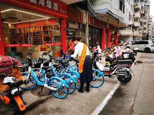 志愿者协助清理小区环境卫生、整理社区周边道路的非机动车