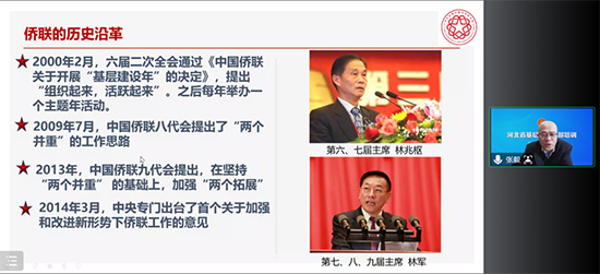 中国华侨华人研究所所长、中国华侨历史学会副会长张春旺同志以《新时代侨联工作的根本遵循学习贯彻习近平总书记关于侨务工作的重要论述》为题作了精彩授课,以丰富的历史史实为基础,系统、全面、深入地论证华侨华人与近代以来实现中华民族伟大复兴的事业紧密相联,党和国家的侨务工作是党史的重要组成部分,也为参训学员分享了学习习近平总书记关于侨务工作的重要论述的体会。