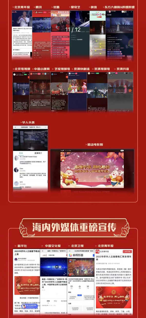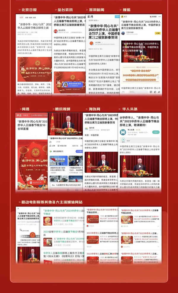 为表达对海外侨胞的惦念,彰显祖(籍)国对侨胞的关爱,由中国侨联主办的2023“亲情中华·同心与共”华侨华人春节晚会于2023年1月19日(腊月廿八)下午4时(北京时间)在各大网络媒体平台同时开播,在海内外侨界引起热烈反响,据统计,截至1月20日16:00,网络观看量累计达 4892.51 万人次。