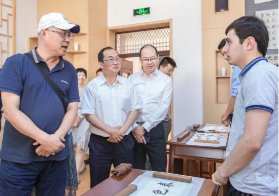 在中国华侨国际文化交流基地——新疆师范大学,左志强一行参观了学校国际文化交流学院新疆籍华侨华人及其子女华文教育项目成果展,察看了书法室、茶艺室等教学设施,同教师代表、留学生深入交流。