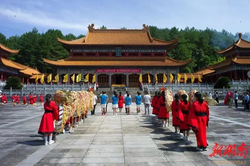 在宽阔的祭祀广场,营员们肃穆伫立,神农大殿金黄色的琉璃瓦顶在蓝天白云的映衬下熠熠生辉。主持人宣布击鼓九通,鸣金九响,鸣炮奏乐,营员们向始祖炎帝敬献五谷果品、祈福香和花篮。来自长沙的女孩徐肇谦代表营员们恭读《祭炎帝文》,焚帛书。随后,大家进入神农大殿参拜瞻仰。