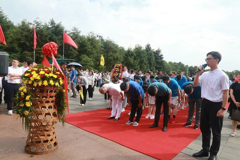 广场上人流如织,营员们紧随两位警卫战士抬起的花篮,在庄严的曲声中缓步前行。湖南省侨联、湘潭市侨联、韶山市侨联以及湖南省宋旦汉字艺术博物馆的负责人也走在队伍中。走上广场西端的台阶,将花篮放置在毛主席铜像前,全体营员三鞠躬,绕铜像一周步行后,表达对伟人的崇敬与缅怀。