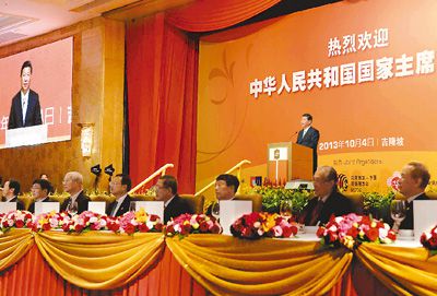 人民网吉隆坡10月4日电 (记者杜尚泽、暨佩娟)正在马来西亚进行国事访问的国家主席习近平和夫人彭丽媛4日在吉隆坡出席马来西亚各界华侨华人欢迎午宴。